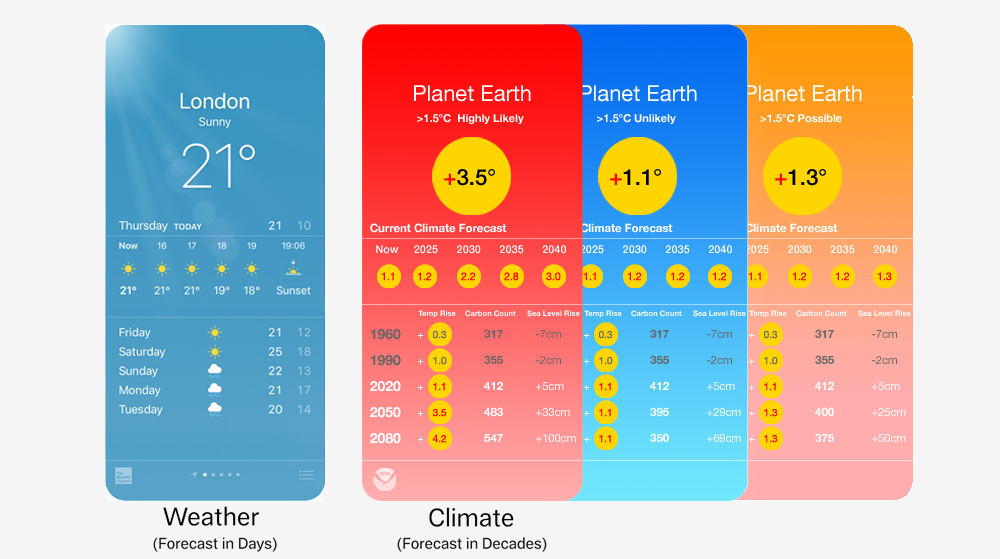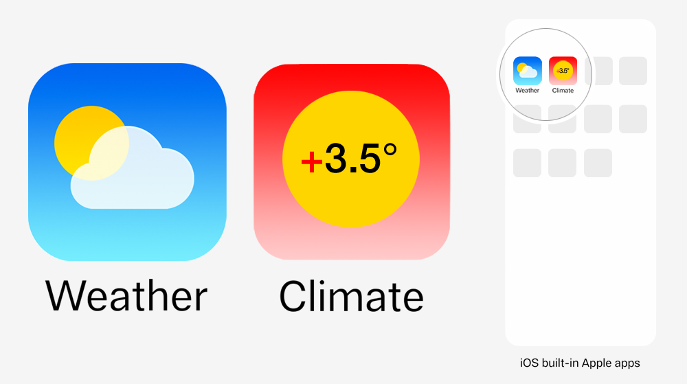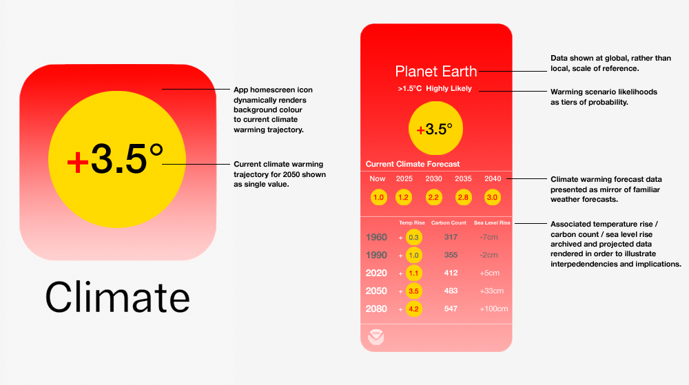 Climate App c / The Apple App Store was launched in 2008, by 2010 Apple had trademarked the phrase 'There's an app for that' - declaring their intention to digitise and universalise all aspects of our lives into application solutions. With the #climatecrisis being the single biggest challenge that we now face, it remains questionable why 'There's isn't an app for that'. #FridaysforFuture As an iteration of Weather & Climate this speculative provocation couples the built-in iOS Weather app with a dedicated built-in Climate app for all future iOS installations and upgrades. The app aims to visualise and simplify climate change 'forecast' data in the same way as weather data, and increasingly domesticate awareness and understanding of the longterm implications of current global warming trajectories.