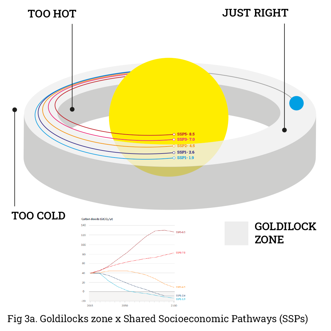 If we know that the empirical count of Carbon PPM is increasing, and that it is explicitly related to global temperature increases, and that both of these variable are governable by our actions, then why are not acting? Perhaps the issue is that an x-y axis graph isn't that appealing? What if we thought of global temperature increase not as a linear graph, but in relation to our relative orbit of the Sun? Lived experience teaches us that the closer we come to a hot object the greater we experience its heat. And so in relative notions the continual burning of fossil fuels is an equivalent to powering the orbit of 'Space Ship Earth' further and further towards the Sun. And as such the closer we (relatively) go the more likely we are to exit to 'Goldilocks Zone' as the only inhabitable part of the solar system that we know. Of the five global warming scenarios the IPCC are currently illustrating anything above SSP 2 is going to risk the 'just right' narrow degree of inhabitability we currently exist within. Creative Commons Attribution: You are invited to publish, reference or iterate this c licensed material for non-commercial purposes as long as you follow the license conditions. Below is a suggestive copy and paste attribution for this work. ted@ted-hunt.com | @_ted_hunt | |