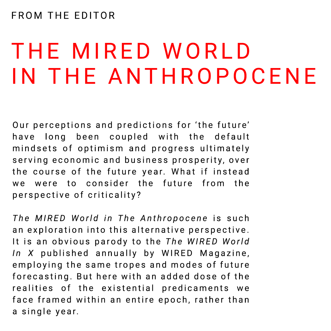 The MIRED World in The Anthropocene c / Why do trend reports always default to mindsets of optimism and progress ultimately serving economic and business prosperity? And why do they only situate themselves within 12 month timeframes of the coming Gregorian calendar year? The MIRED World in The Anthropocene is an alternative exploration into the future seen through the perspective of criticality within the timeframe of an entire epoch.