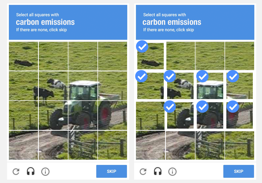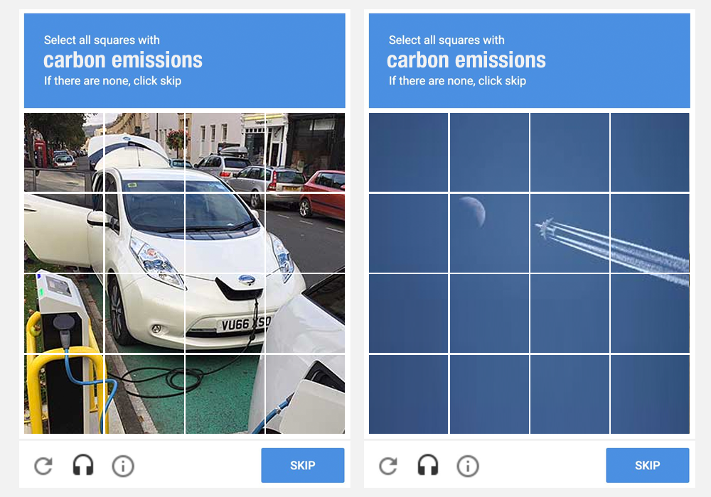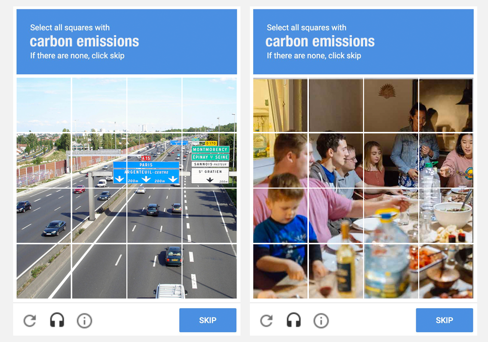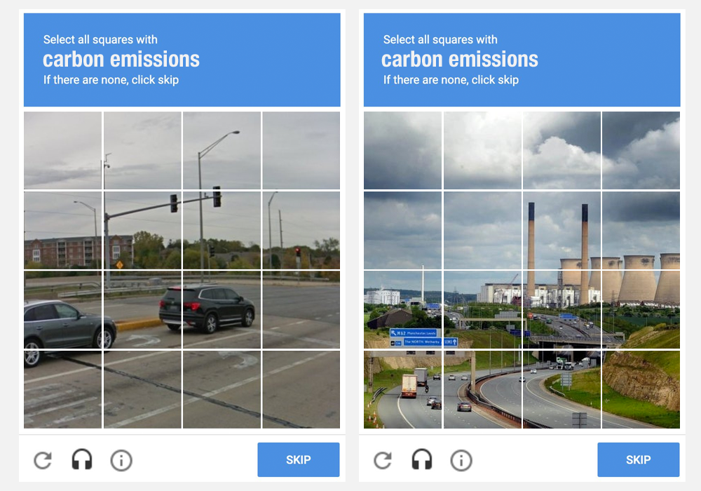 Carbon ReCAPTCHA c / A pun upon the complex moral philosophy of the Carbon Capture industry coupled with the seeming objectivity of Google's user authentication (/ thinly veiled mass machine learning tool) reCAPTCHA. Rather than exploiting human cognition to covertly train the digitisation projects of Google Books and Google Self Driving Car initiatives, Carbon ReCAPTCHA attempts to untangle the knotty technical and moral complexities of defining sources of carbon emissions. Is a t-shirt a source of carbon emission? How about an asphalt road? Or a child? Is the charging electric car exempt and the parked petrol car guilty or vice-versa? What logic might machine learning make of what it perceives that we perceive? ![]() ![]() ![]() ![]()