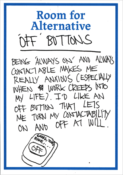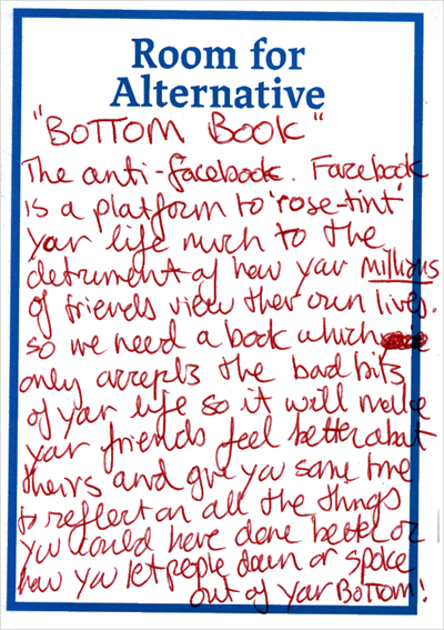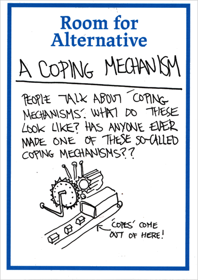 Room for Alternative. / Royal Festival Hall, London, Changing Minds Festival / Design Tonic, Saturday 6 & Sunday 7 February 2016 . A two-day drop-in 'thinking through making' workshop and exhibition that actively explores ways of assisting with personal neuroatypical day to day experiences, rather than simply setting out to solve or cure typecasts of mental health issues. Room for Alternative openly enacts the MA Design Interactions philosophy of designing for the complex, troubled people we are, rather than the easily satisfied consumers we are supposed to be. For more information visit: roomforalternative.co.uk ![]()