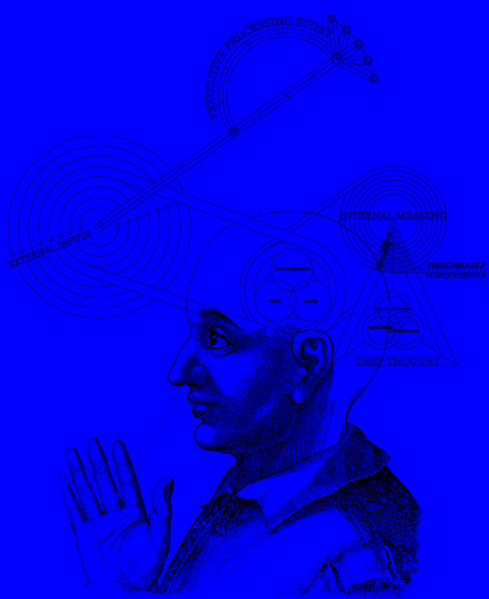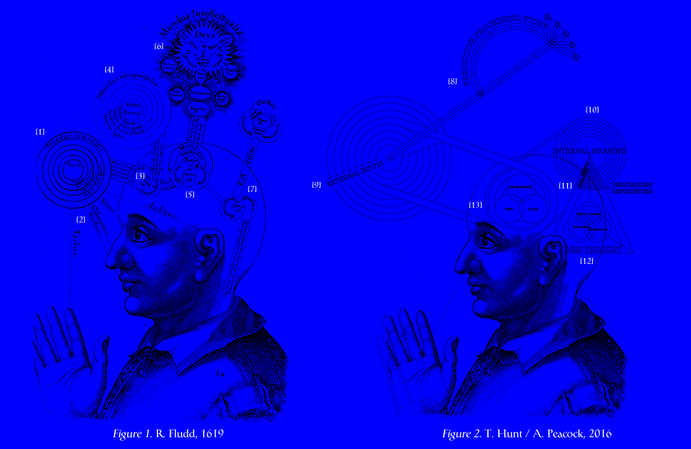 Design for an Entrance to the Internet (Research & Development). / "Our goal with artificial intelligence is to build systems that are better than people at perception - seeing, hearing, language and so on." Mark Zuckerberg, F8 Conference 2016 ![]() ![]() Figure 1: R. Fludd, Utriusque cosmi, Vol. II, Oppenhiem, 1619. On the left, above the forehead floats the circular diagram of the world as perceptible to the senses [1]. It is subdivided into an elemental quinternity which stands in relation to the five senses of man: touch, taste, smell, hearing and seeing [2]. This 'sensitive world' is 'imagined' in the first brain-chamber [3], by the transforming power of the soul, into a shadowy duplicate [4], and then transcended in the next chamber of the capacity for judgment and knowledge [5]: through the keenness of the spirit the soul penetrates to the divine 'world of the intellect' [6]. The last chamber is the centre of memory and movement [7]. Figure 2: Ted Hunt / Adam Peacock, Outsourced Perception, 2016. Reflecting and updating R Fludd's visual model of consciousness here we see a Predictive Processing Story [8] (Andy Clark, Surfing Uncertainty, 2016) continual stimulation by sensation and information which is processed into certainties by the arc of predictions and educated guesses of what might be generating these signals. Where this process used to inhabit the inside of our skulls it is now shown as residing externally, our perceptions are increasingly 'outsourced' to the augmented ether (Internet) as illustrated by the smartphone of the hand which replaces the five senses defined by Fludd. Certainties of the predictive processing story are then fed into our External Inputs [9] which are rendered through the ceaseless updates of smartphones. Here these inputs enter our minds where we begin to make an Internal Meaning [10] of these pre-selected certainties. We are now experiencing a Crisis of Distraction [11] as the frequency of External Inputs we are hardwired to observe and process is limiting our time and ability to practise Deep Thought [12] (Critical Thinking / Reflection / Introspection). This crisis is at a detriment to the trio of our sense of self formed by our Past Experiences, Views and Values [13] as it is deep thought which enables thinking which is singular and original, ultimately forming our sense of self. Our ability to conduct deep thought is being out sourced along with our perception of the world, what Fludd saw as our internal "imagined world" is now imagined by other on our behalf. The internet, in short, is becoming an external extension of our brain and cognitive systems. Perhaps our concerns with making 'machines becoming more like man' should in actual fact be concerns with 'man becoming more like machines'. ![]() ![]() ![]() ![]() Renderings by Adam Peacock. ted@ted-hunt.com | @_ted_hunt | |