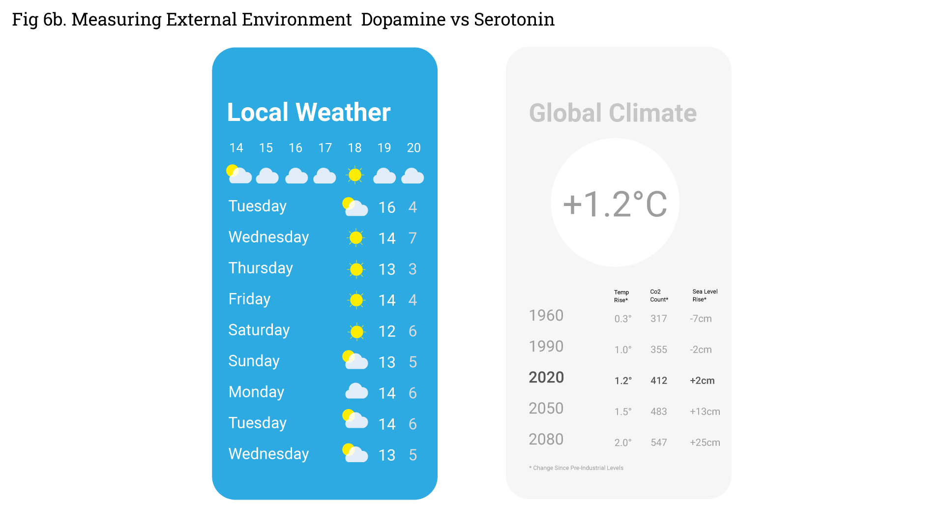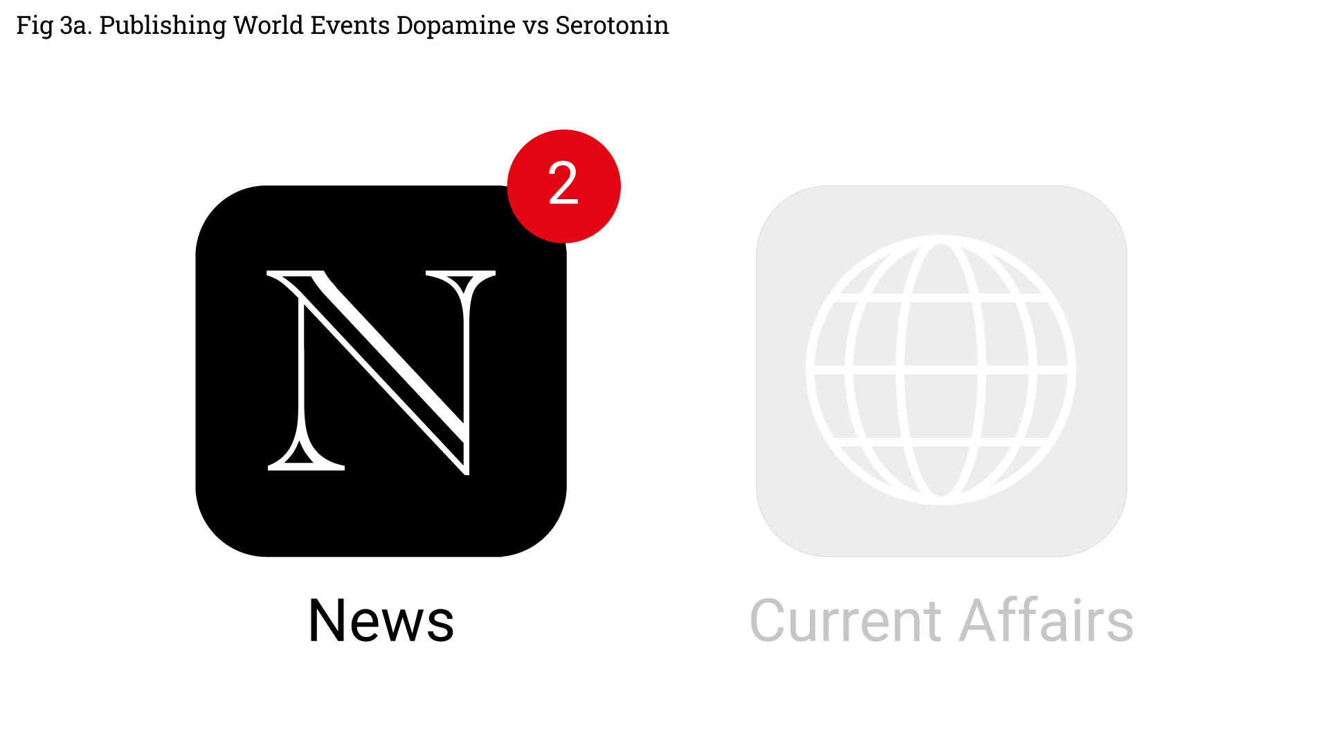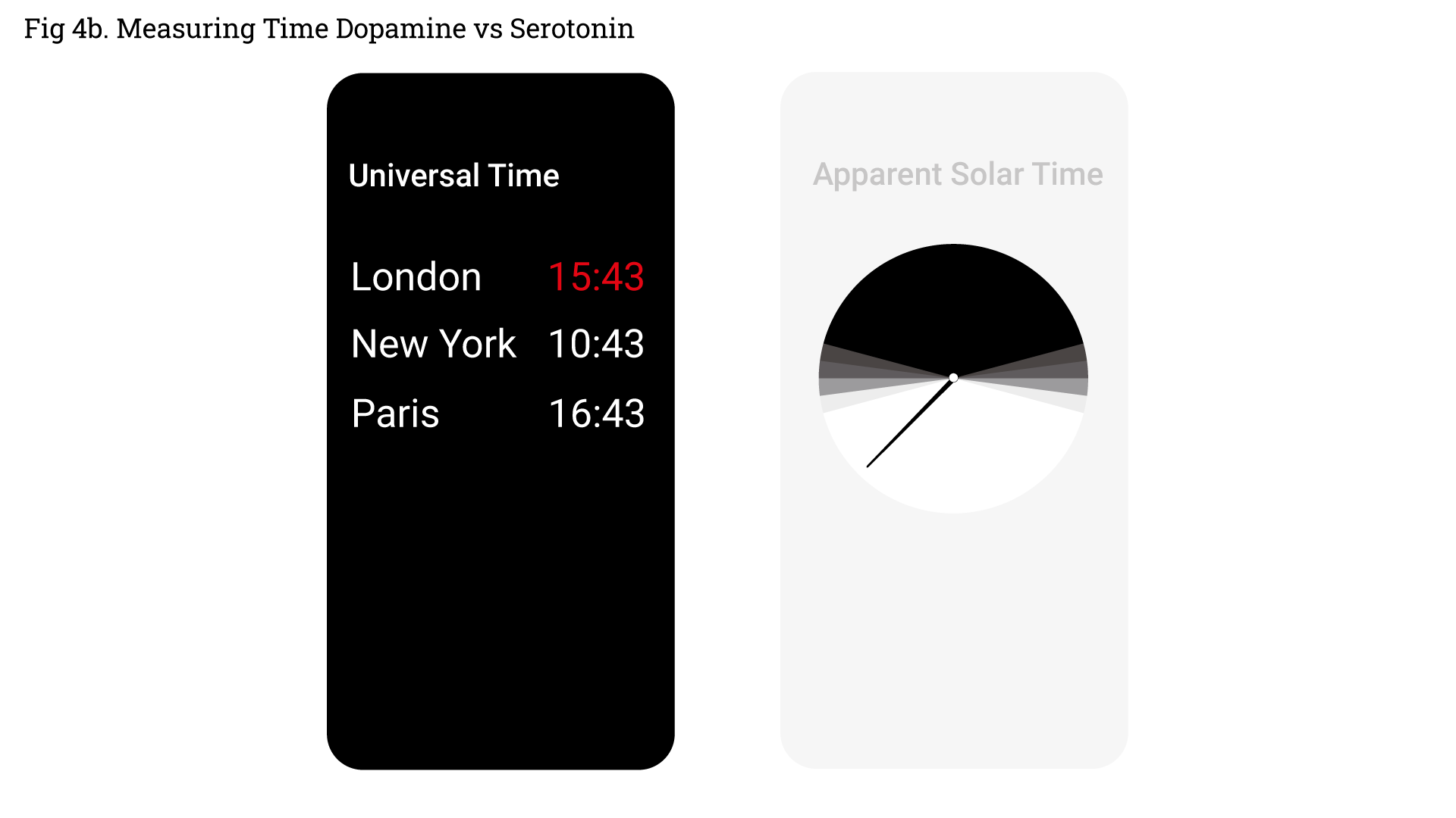 Neuro-Diversification c / Now that pretty much all apps and UX design is engineered to trigger the neurological mood stimulant of dopamine [reducing the metaverse to a neurotypical monoculture of pavlovian quick hits], what might it mean to simply bias design for the neurological mood stabiliser of serotonin? ![]() ![]() ![]() ![]() ![]() ![]() ![]() ![]() ![]() ![]() Fig 1. App icon alerts are designed to distract and stimulate immediate / constant attention while entraining users to habitualised digital dopamine addiction. Fig 2. Removing alerts and reducing home screen from 28 apps to 15 in harmonious colour palette where the subtle contrast of border colour indicates content updates. Fig 3a. The distinction between biasing for serotonin versus dopamine is best illustrated in the distinct differences in editorial values found between publishing 'news' and 'current affairs'. Fig 3b. "Current Affairs..differs from regular news broadcasts that place emphasis on news reports presented for simple presentation as soon as possible, often with a minimum of analysis." - Wikipedia Fig 4a. Where dopamine release craves numerical quantification, serotonin release embraces the qualification of relative values such as sunlight. Fig 4b. Redesigning time measurement in the interests of serotonin might abandon numerical quantification entirely. Fig 5a. Where the Sun might replace the tyranny of the standardised clock, the Moon would replace the tyranny of the linear calendar. Fig 5b. Lunar Cycles replace the lunacy of grids. Fig 6a. Where dopamine demands the quick hits of immediate results, serotonin stabilises our relationship to the natural world. Fig 6b. Hence a considering the forecasts of a safe and just environment for future generations might take precedence over forecasts of a nice few days of sunshine. Creative Commons Attribution: You are invited to publish, reference or iterate this c licensed material for non-commercial purposes as long as you follow the license conditions. Below is a suggestive copy and paste attribution for this work. ted@ted-hunt.com | @_ted_hunt | |