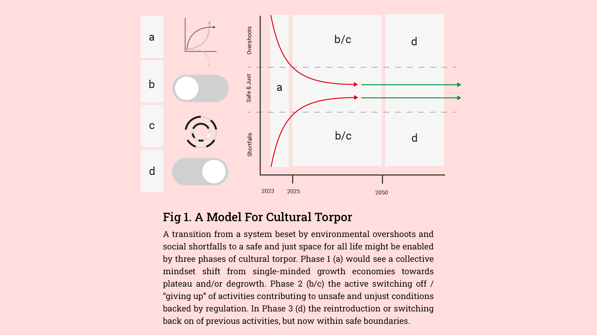 A Model For Cultural Torpor c / Torpor describes a hibernation like state exhibited in some animals as a means to navigate harsh environments. Might we look to a form of biomimicry of torpor in order to navigate our species, and all life, to a safe and just future space.